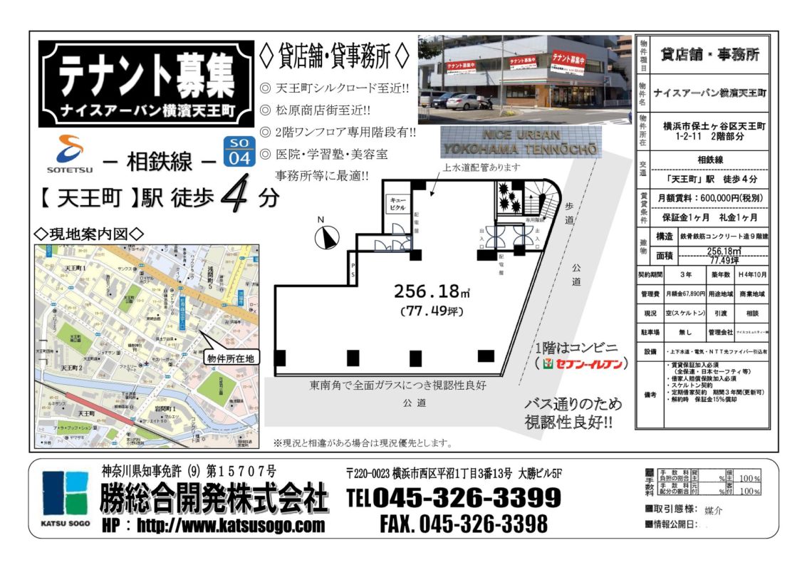 【建物】 構造:RC造9階建2階部分  賃貸面積:256.18㎡(77.49坪)